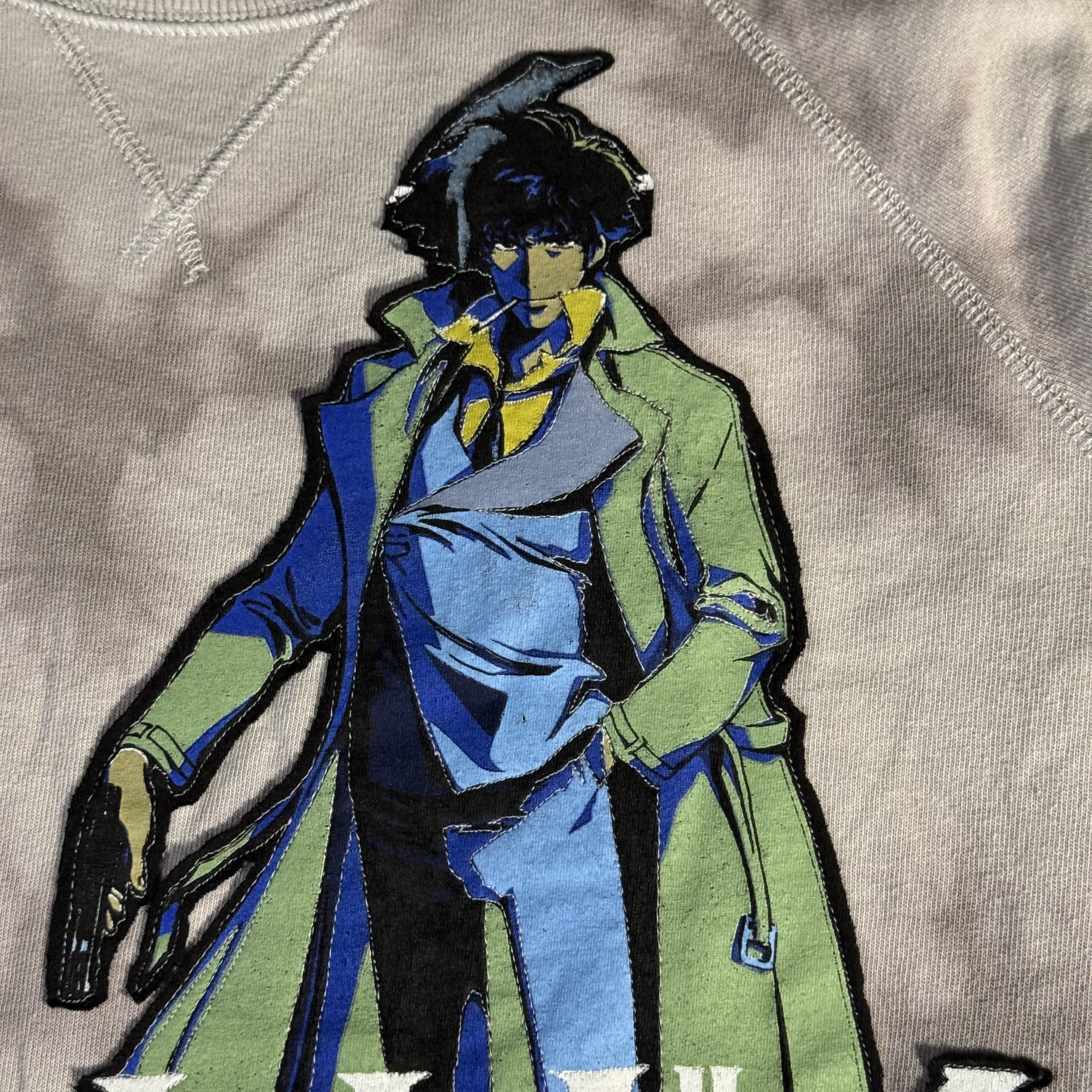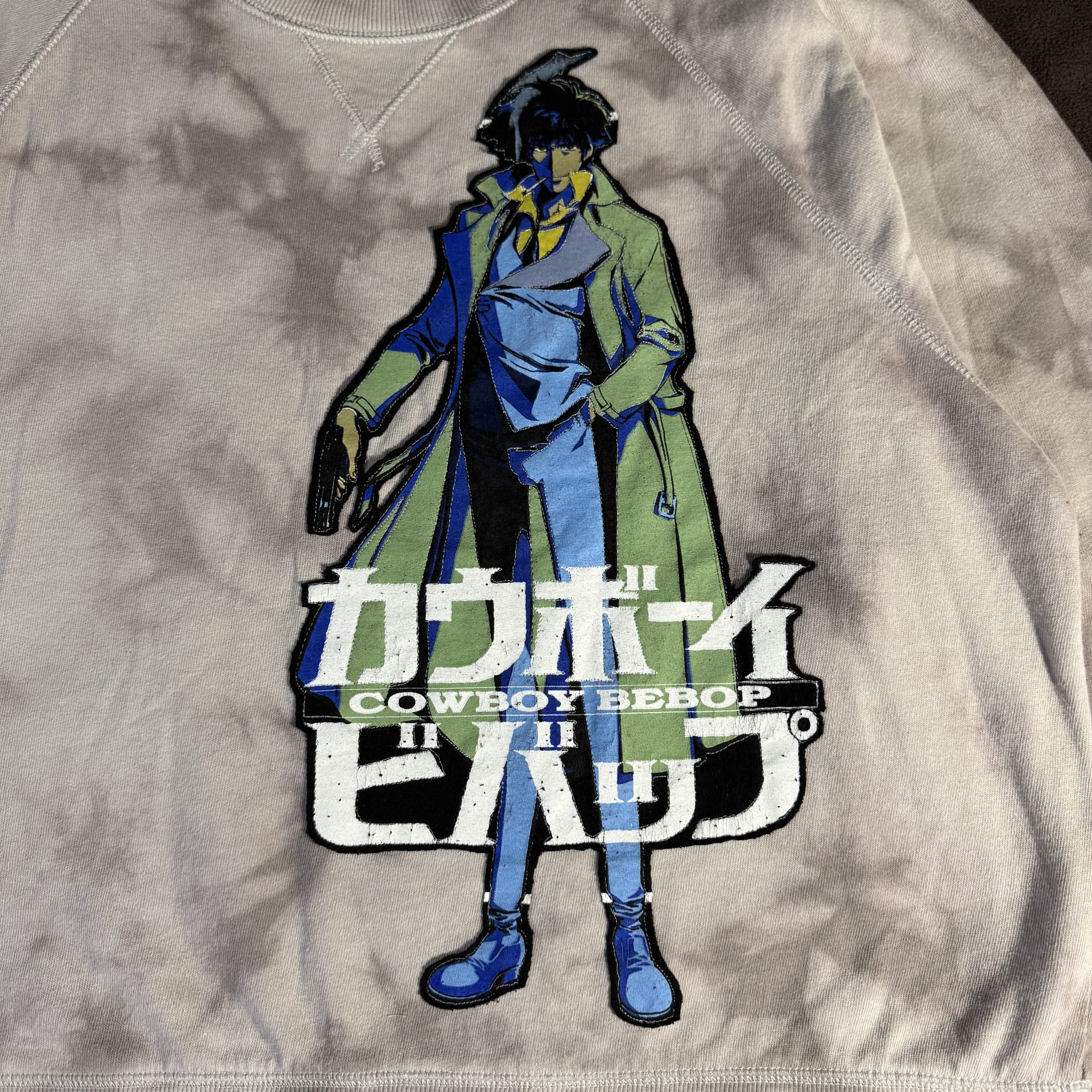 This unisex, one of a kind, loose-fitting, boat neckline, long raglan sleeved sweatshirt is made from an upcycled shades of grey tie-dye sweater and Cowboy Bebop t-shirt quilted to the front.