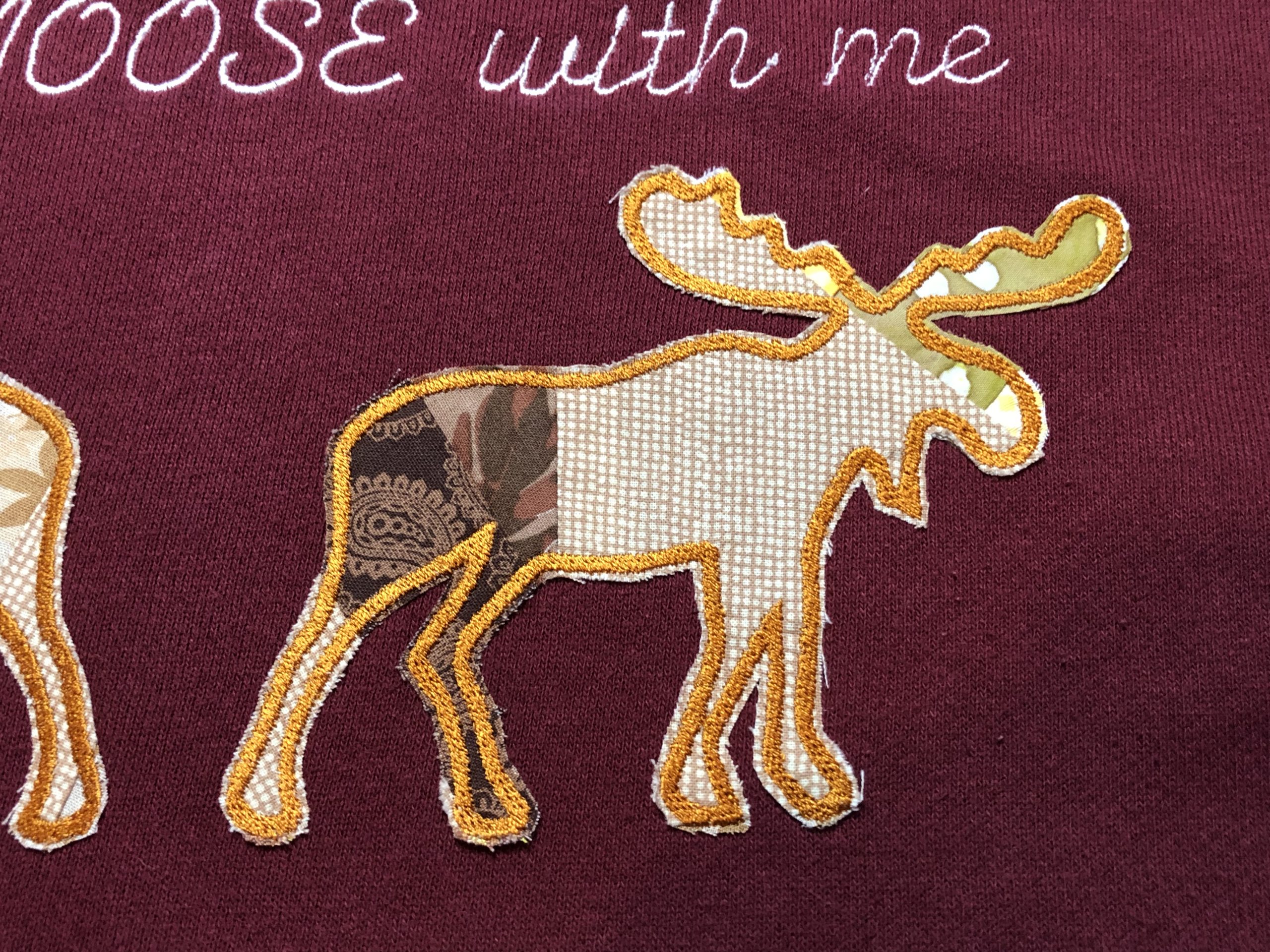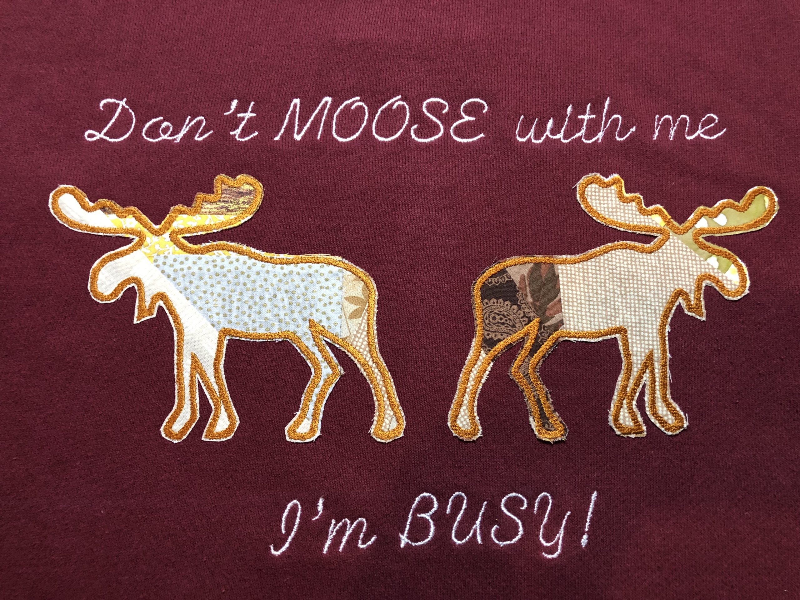 This custom unisex, one of a kind, long sleeve, crew sweatshirt is made from an upcycled burgundy sweatshirt and custom moose patches and “Don’t MOOSE with me I’m BUSY!” embroidered on front.