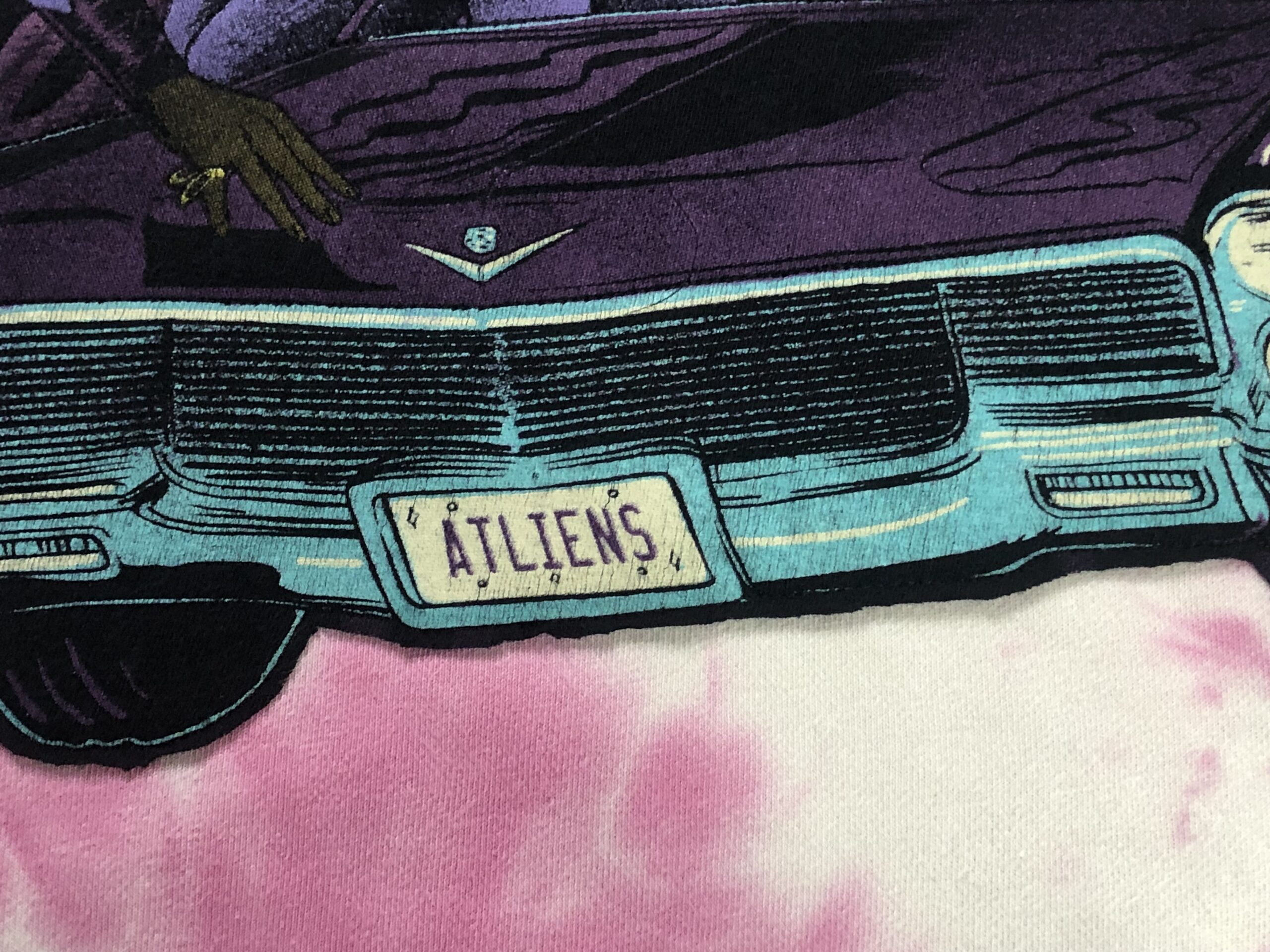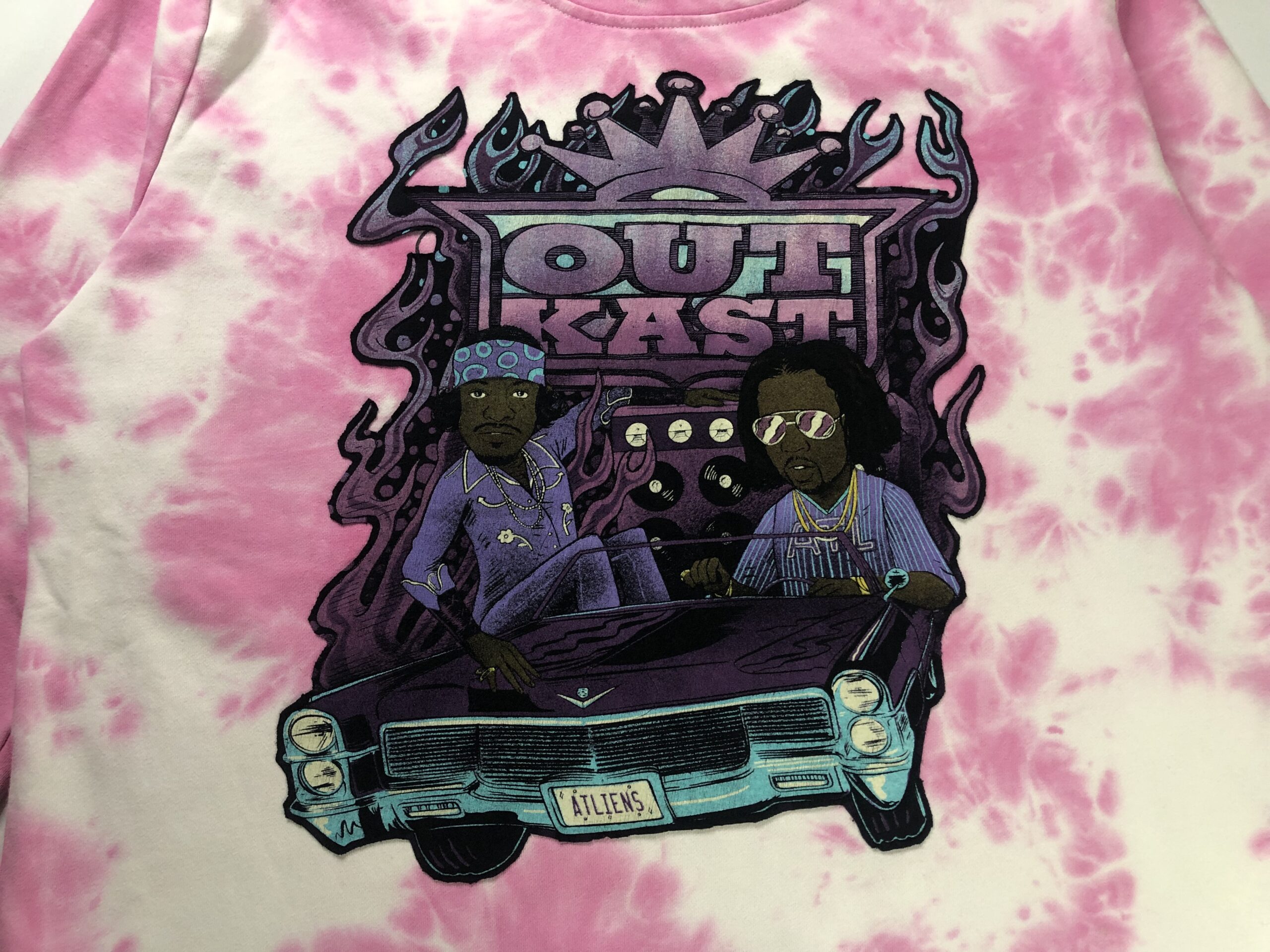 This unisex, one of a kind, loose-fitting, crew neck, long sleeve sweatshirt is made from an upcycled pink and white tie-dye sweater and an Outkast t-shirt quilted to the front.