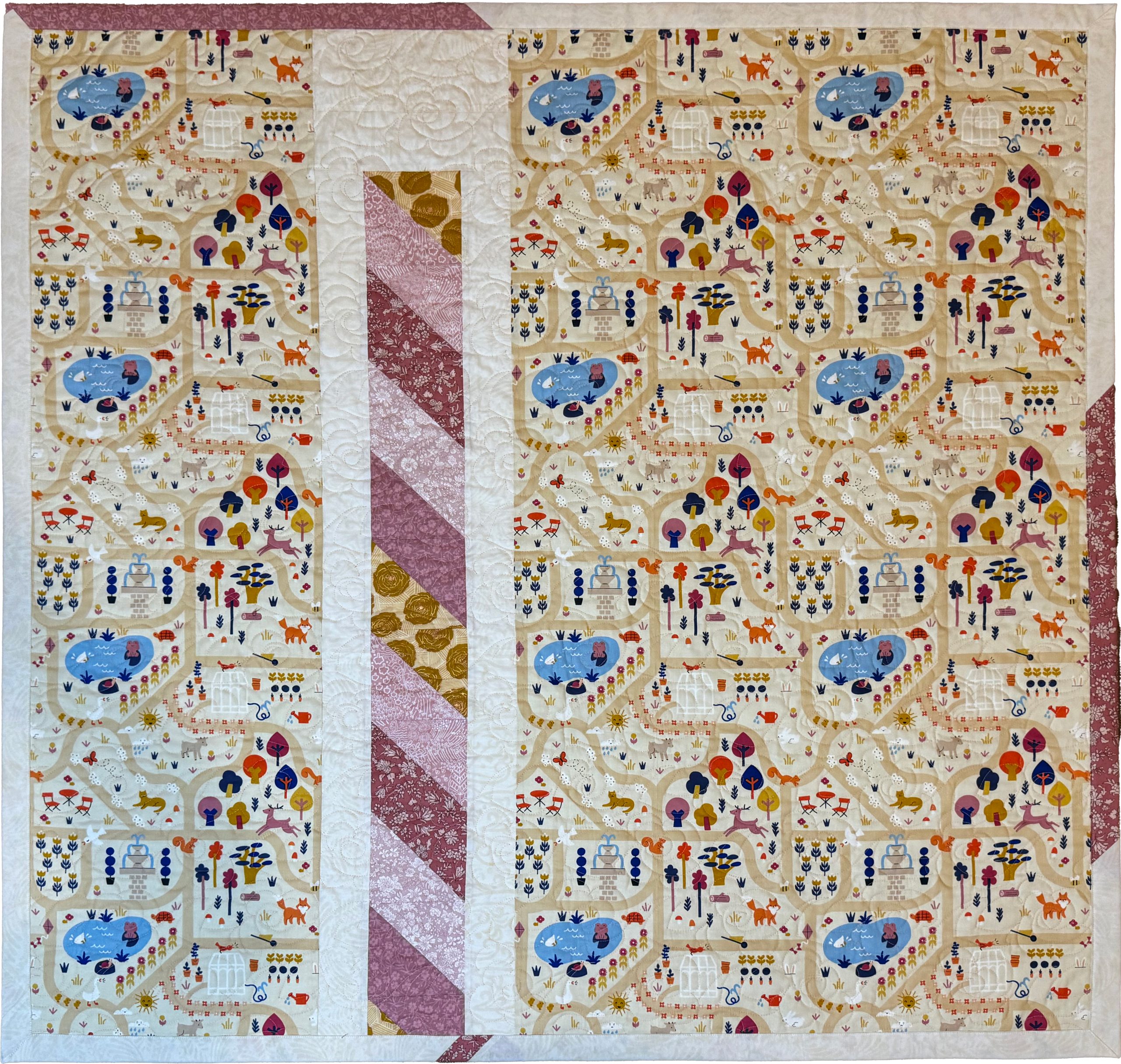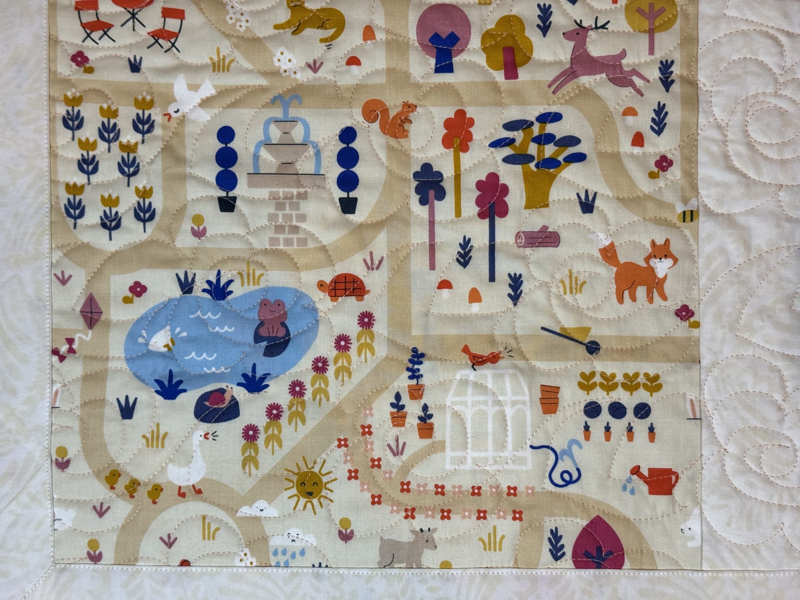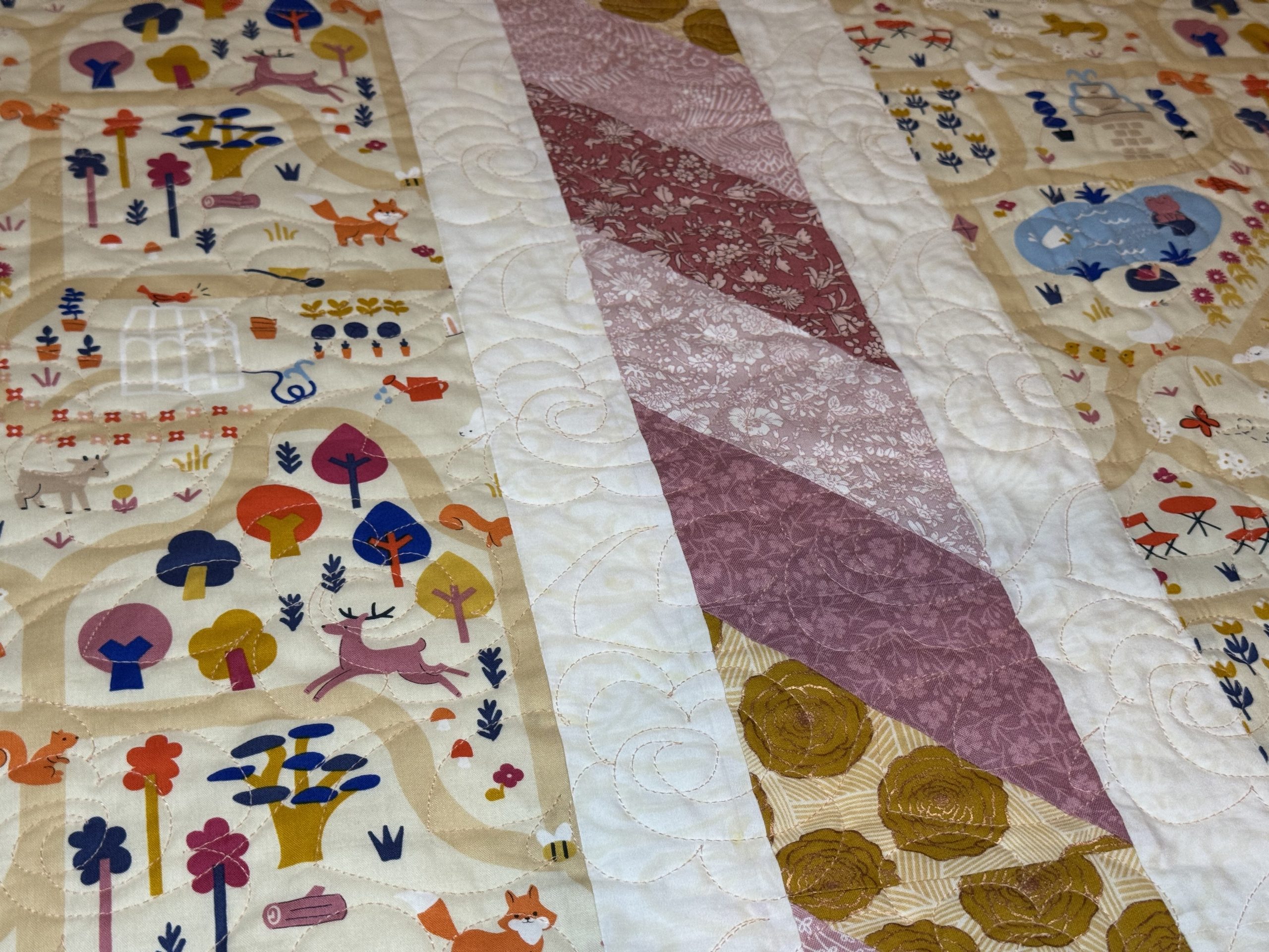 This one-of-a-kind quilt is sure to be a life long treasure for your little one. Made form an assortment pastel florals and cream batik fabrics to create this pinwheel quilt design. Quilted together with a free motion flower quilting pattern. Backed with an adorable park scene with joyous animals quilt print sliced with accenting fabrics featured on the front.