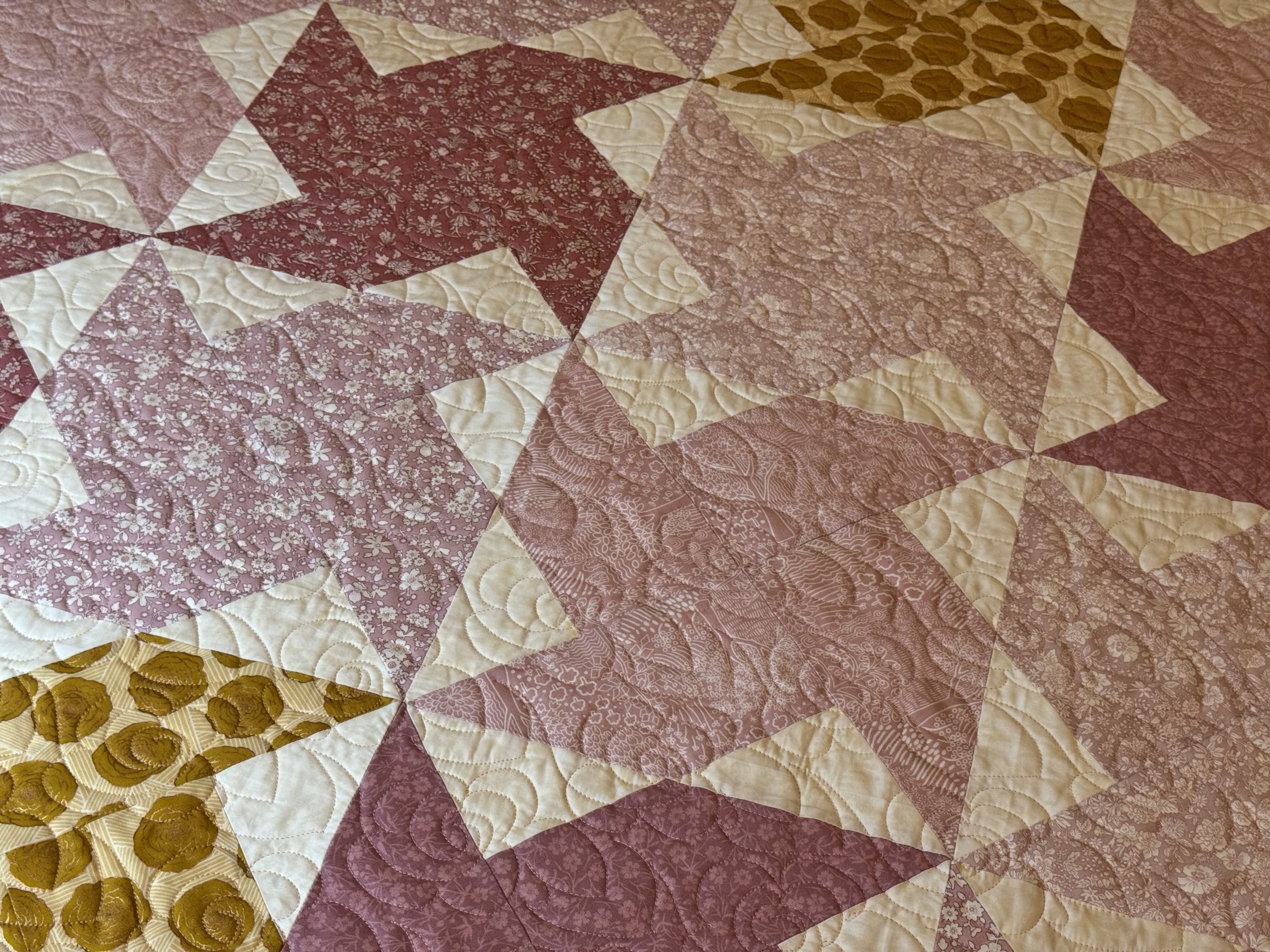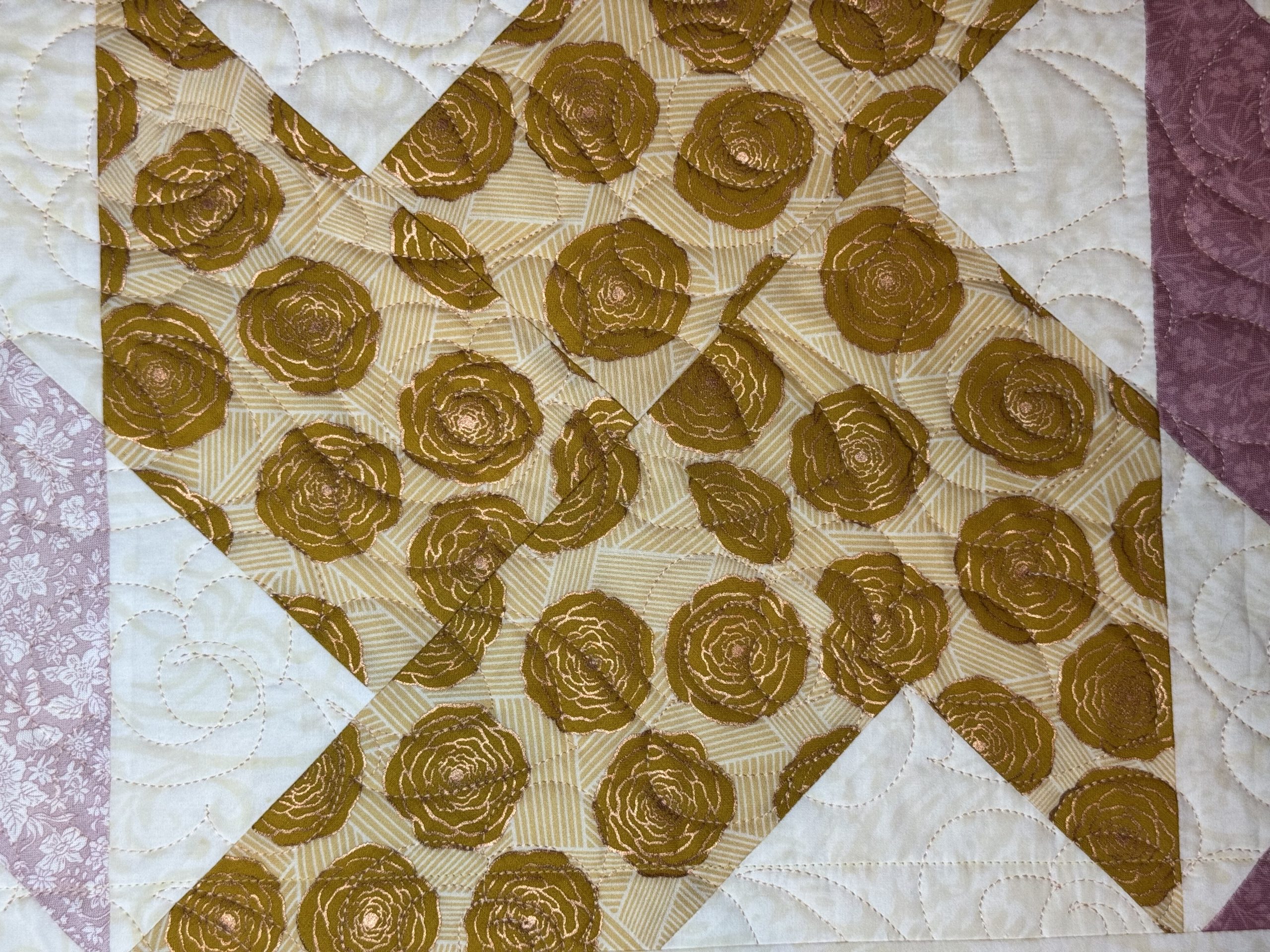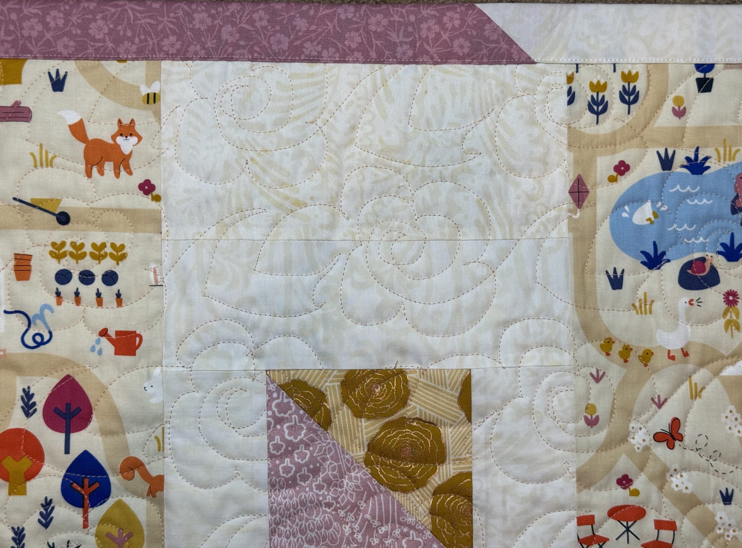 This one-of-a-kind quilt is sure to be a life long treasure for your little one. Made form an assortment pastel florals and cream batik fabrics to create this pinwheel quilt design. Quilted together with a free motion flower quilting pattern. Backed with an adorable park scene with joyous animals quilt print sliced with accenting fabrics featured on the front.