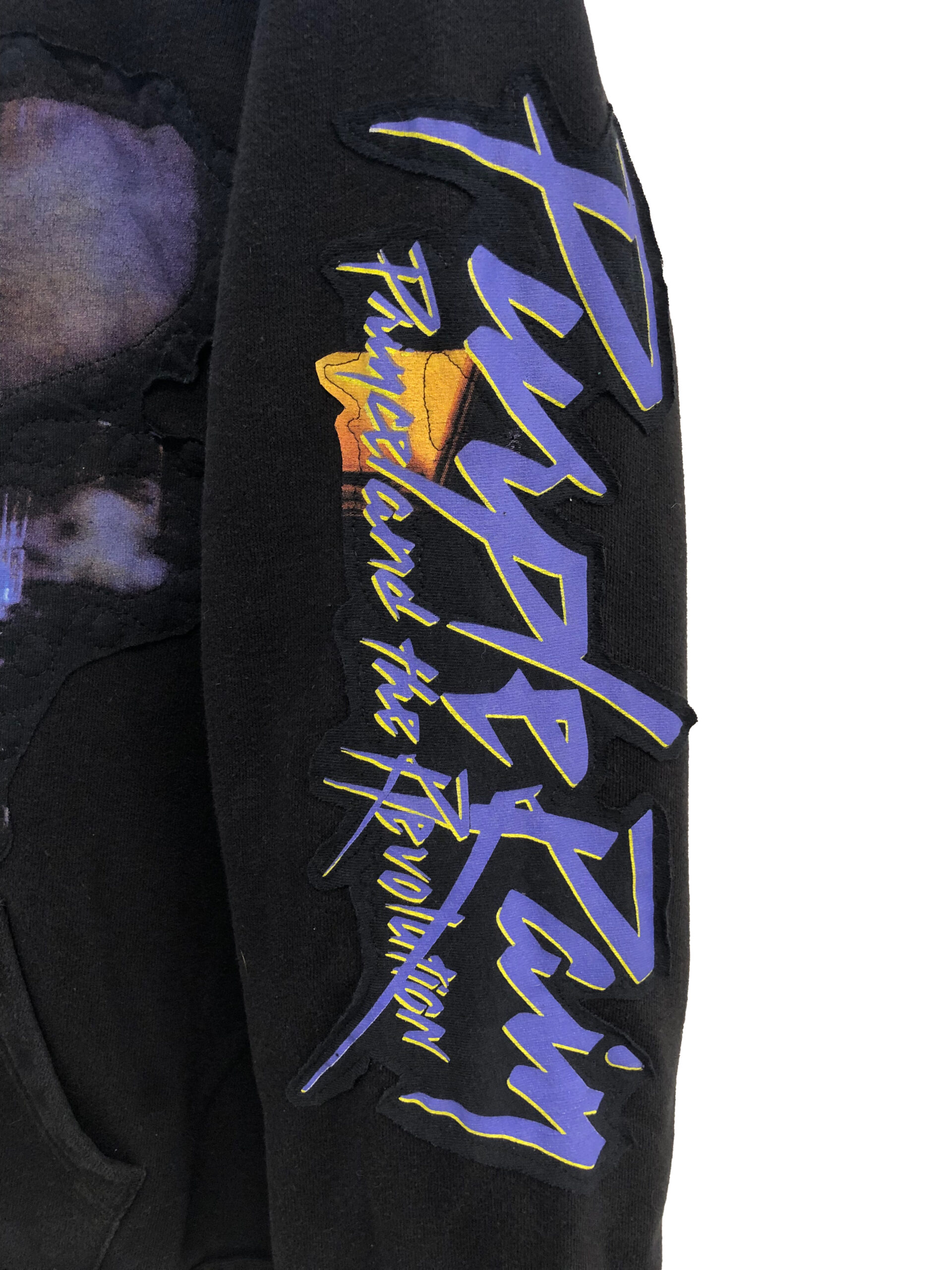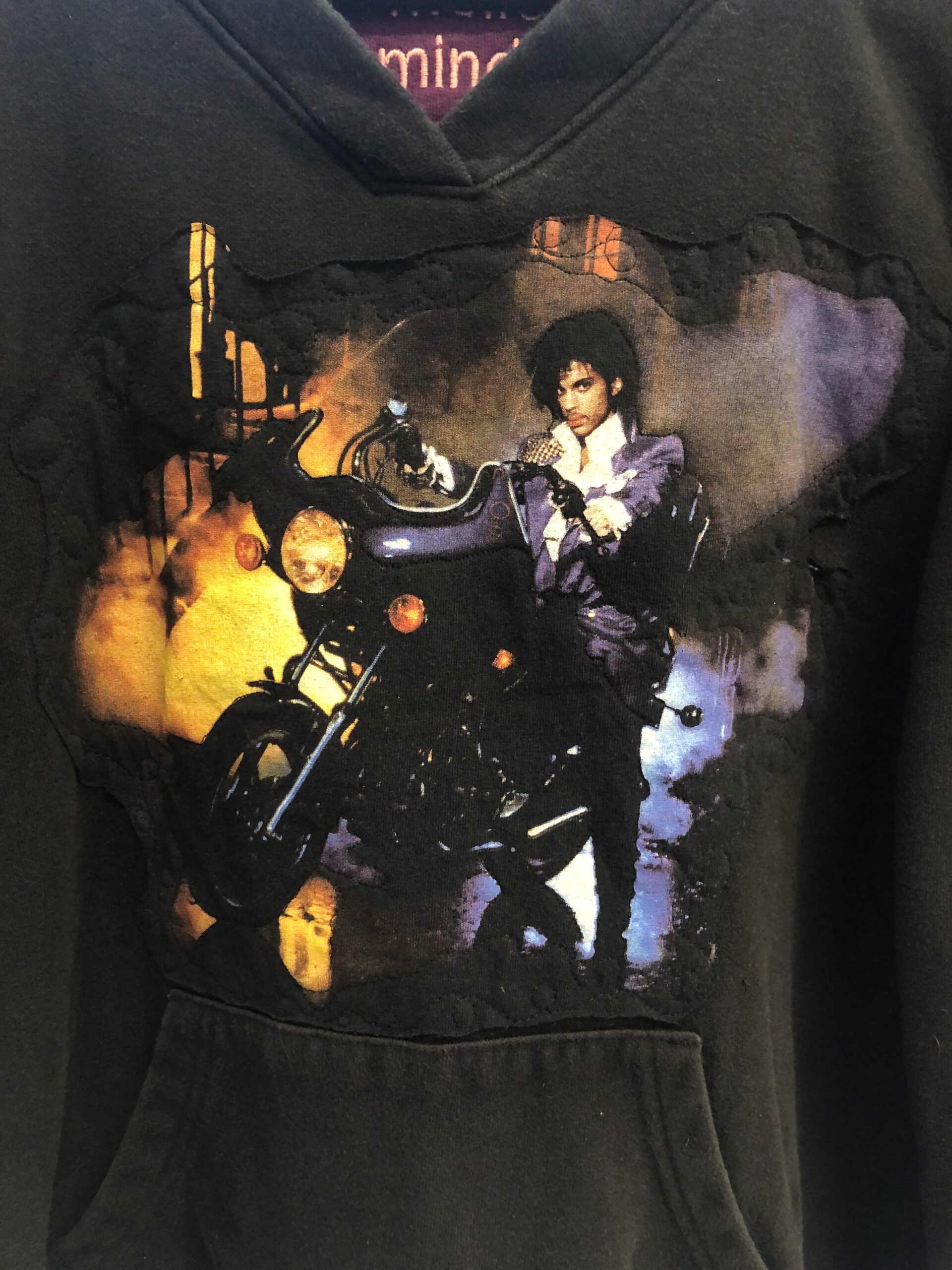 This unisex, one of a kind, loose-fitting, long sleeve hooded sweatshirt with a kangaroo pouch pocket is made from a black upcycled hoodie and a Prince t-shirt quilted to the front and left sleeve.