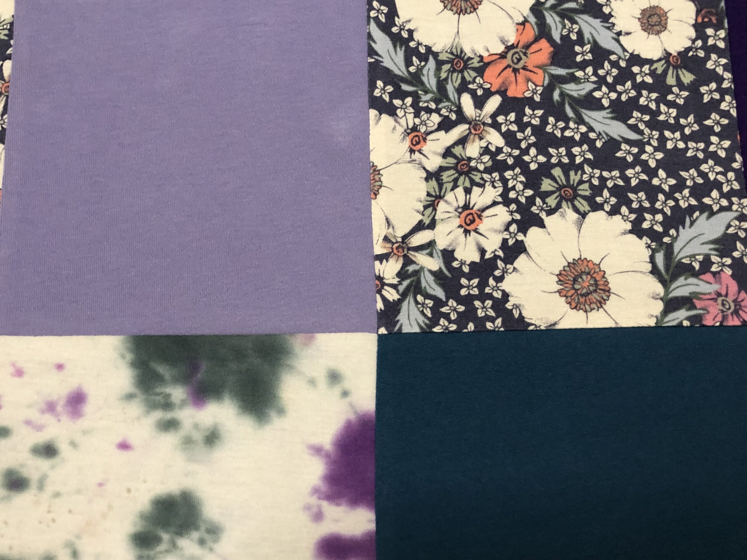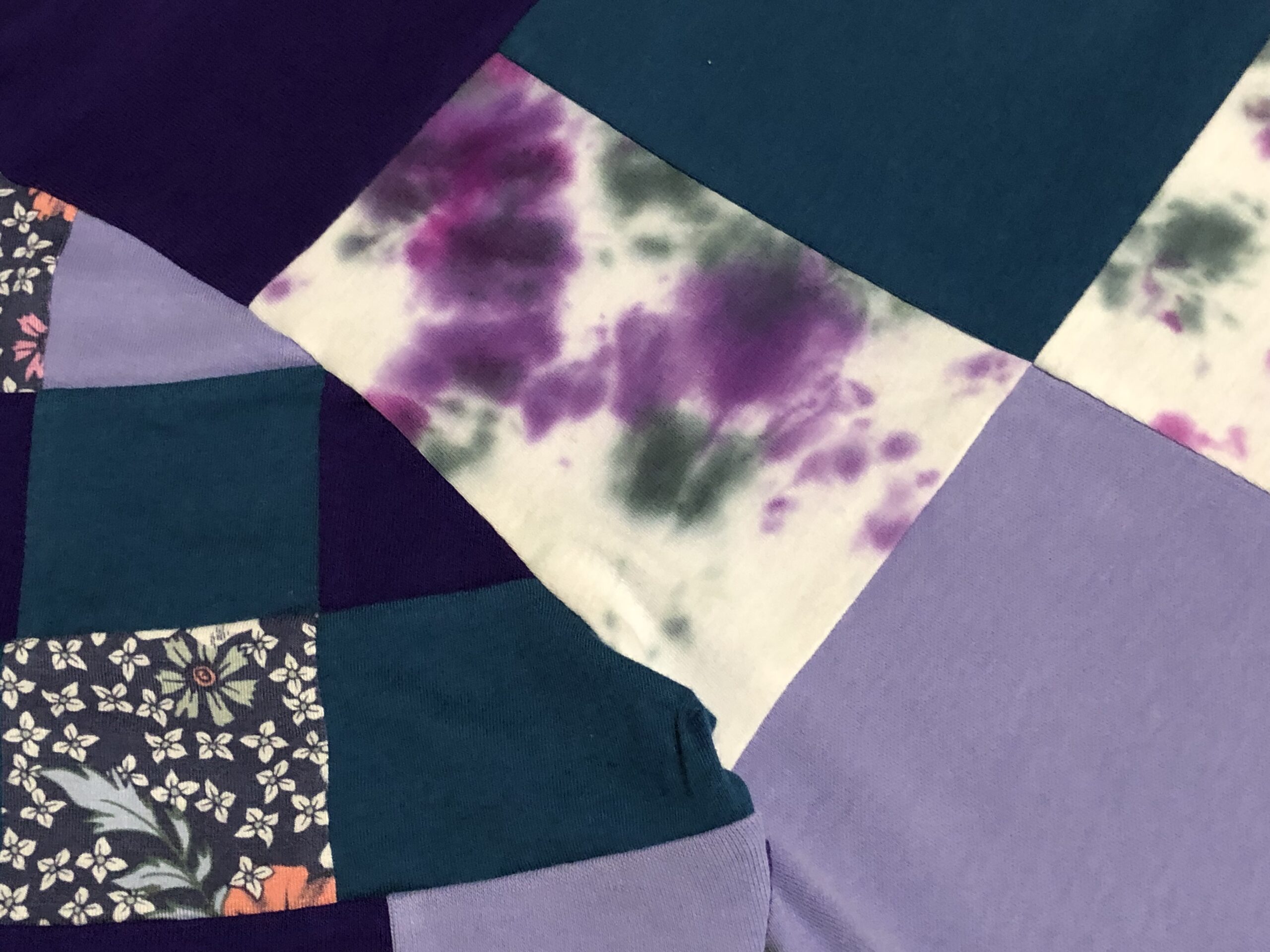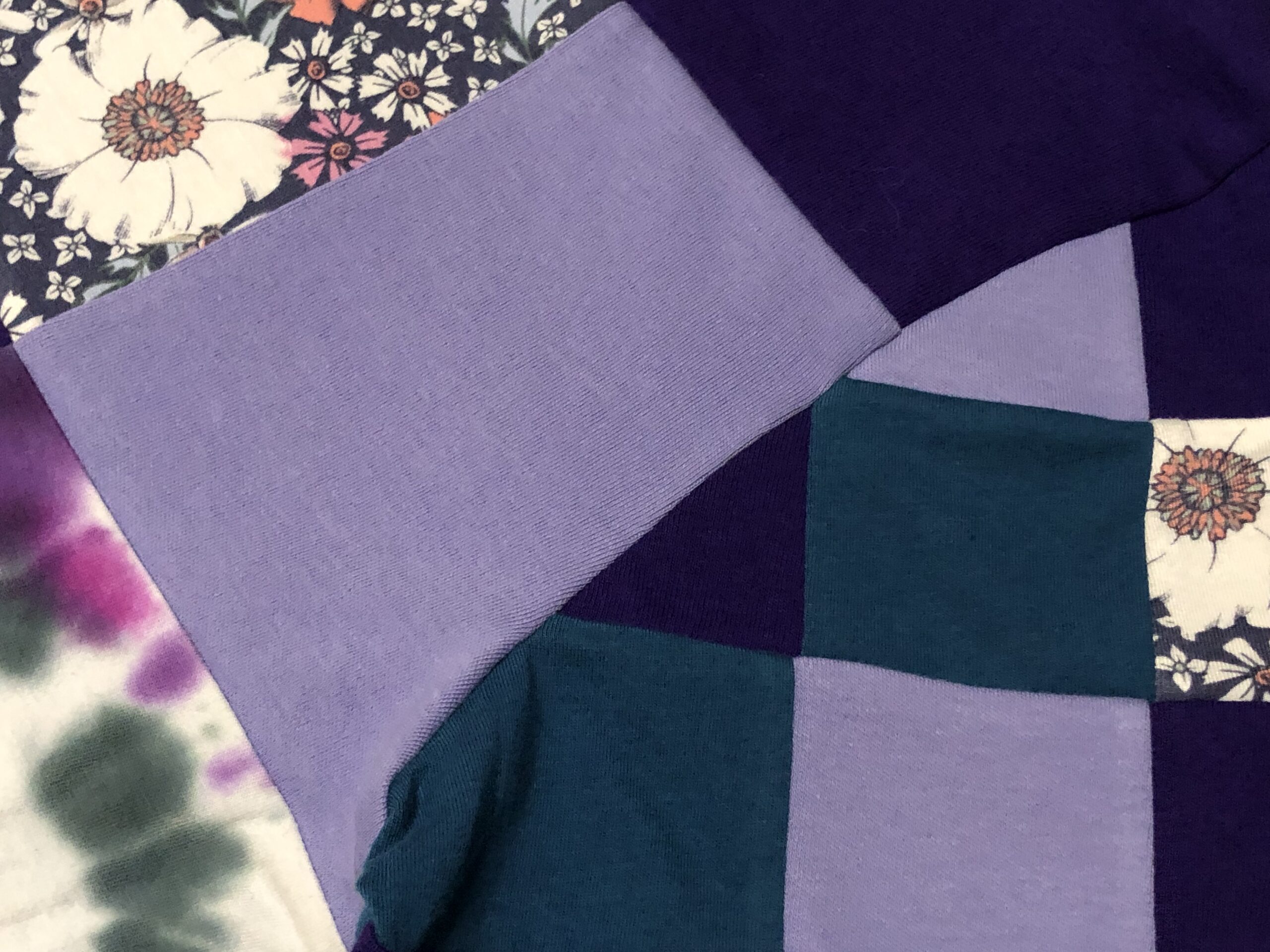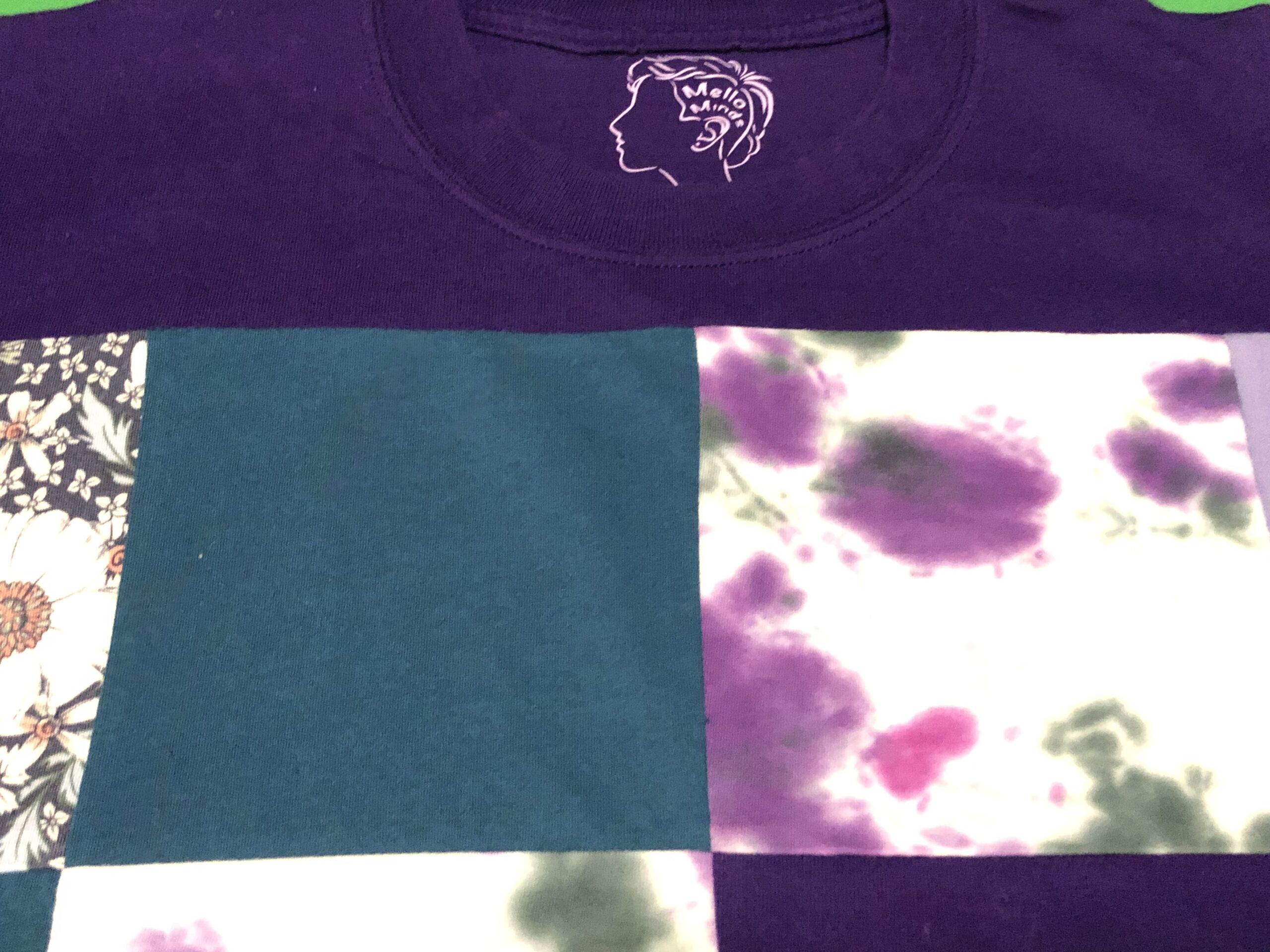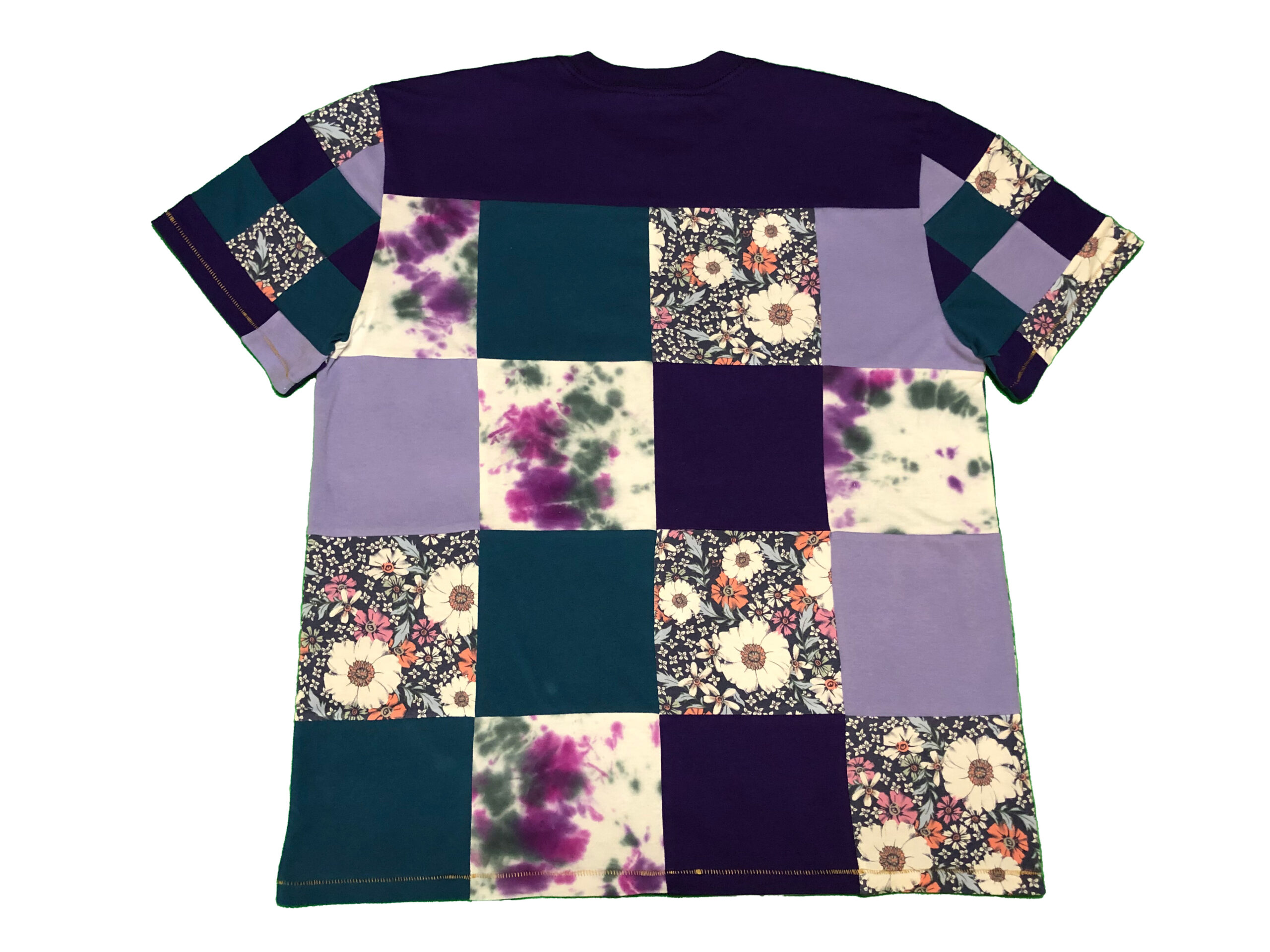 This unisex, one of a kind, loose-fitting, short sleeve t-shirt is made from upcycled t-shirts and knit fabrics to create this piece of wearable art featuring tie-dye and floral print.