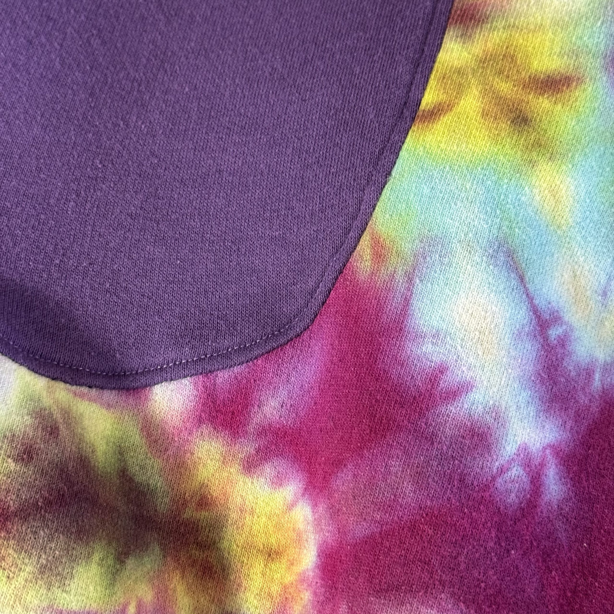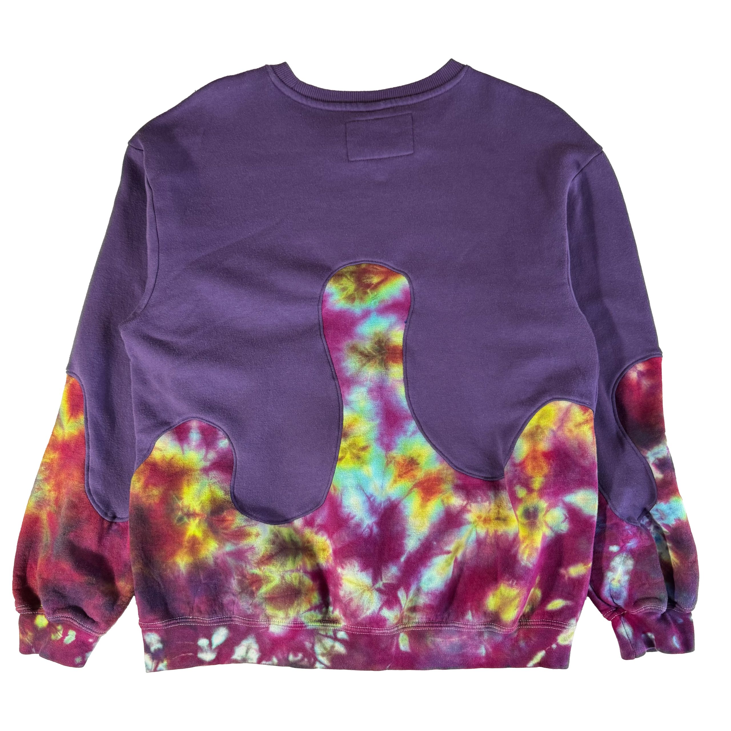 This unisex, one of a kind, loose-fitting, long sleeve, crew neck sweatshirt is made from two upcycled sweatshirts to create this tie-dye lava lamp design featuring a front kangaroo pouch pocket.
