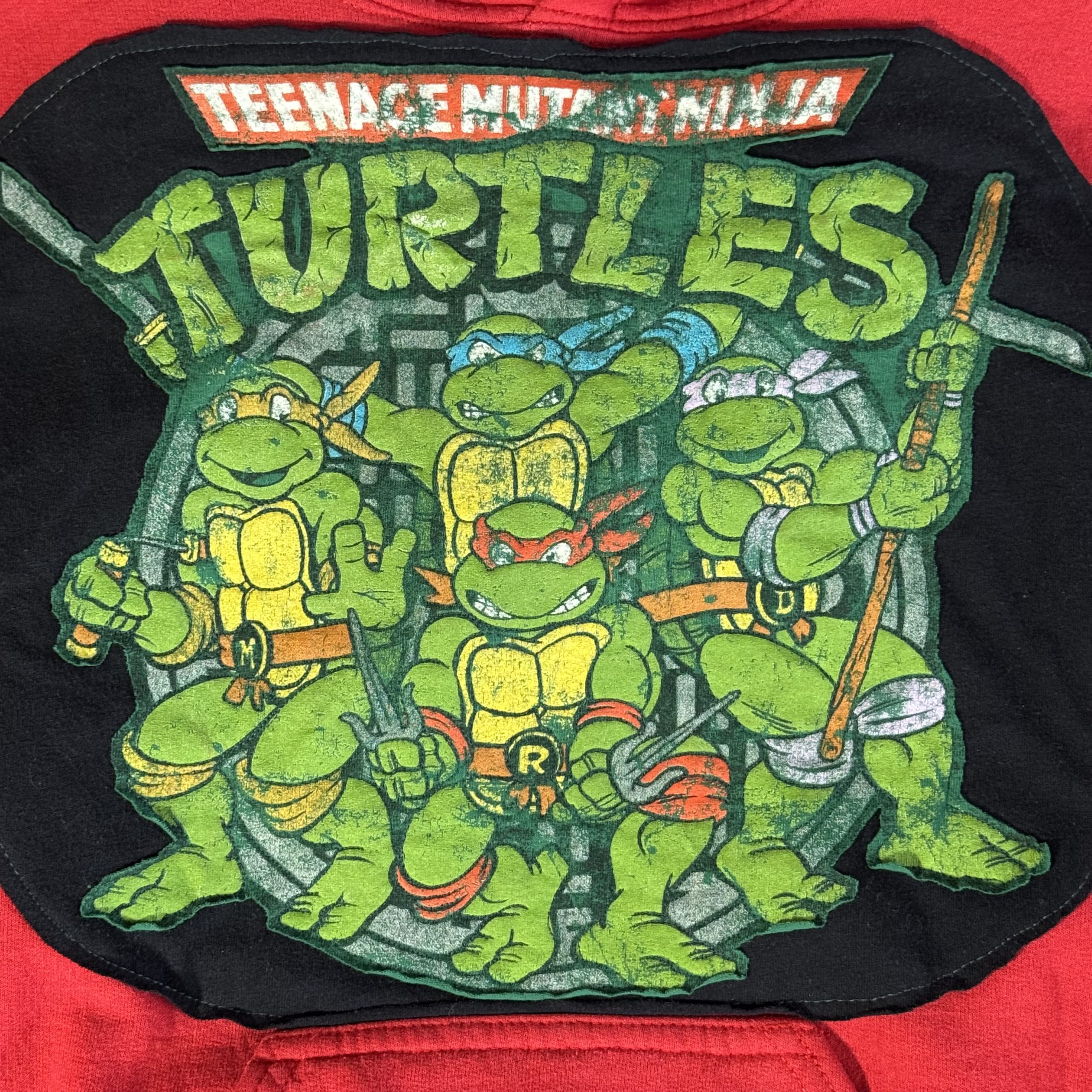 This unisex, one of a kind, loose-fitting, long sleeve hooded sweatshirt is made from a red upcycled hoodie a Teenage Mutant Ninja Turtle t-shirt quilted to the front over a black t-shirt backdrop. Featuring a kangaroo pouch pocket.